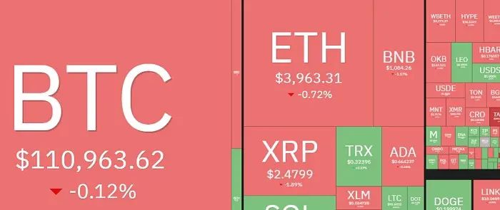Pasar cryptocurrency terus menunjukkan tren campuran. Menurut data dari platform data pada pukul 5:30 pagi tanggal 22, Bitcoin (BTC) diperdagangkan pada $110,963.62, turun 0.12% dari hari sebelumnya.
