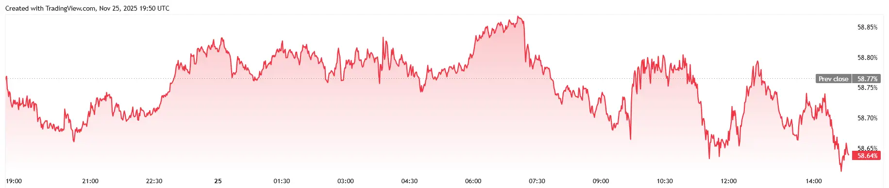 Volume perdagangan harian turun 12,07% menjadi $65,3 miliar, dan kapitalisasi pasar juga lebih rendah di $1,73 triliun. Dominasi Bitcoin mereda 0,22% menjadi 58,64%, menunjukkan kinerja yang sedikit lebih buruk dibandingkan dengan altcoin.