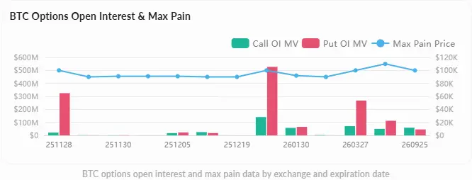 Volume posisi turun 2,39% dalam 24 jam, menunjukkan sinyal pendinginan dan konsolidasi leverage. Tingkat pembiayaan menunjukkan diversifikasi, Binance (+0,0051%) dan OKEx (+0,0050%) cenderung bullish, Bybit (-0,0037%) cenderung bearish, secara keseluruhan netral sedikit bullish. Titik sakit maksimum opsi berada di $90.000-$100.000.