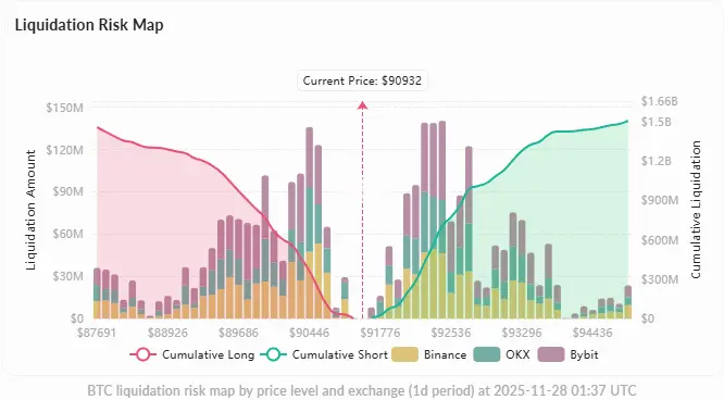 Grafik risiko likuidasi menunjukkan total likuidasi posisi long sebesar $1,46B di bawah $87,691, sementara total likuidasi posisi short di atas $94,816 adalah $1,43B, menunjukkan risiko penurunan yang tidak simetris. Namun, dalam 24 jam terakhir, likuidasi posisi short mendominasi ( $61,6M vs $10,9M posisi long ), memberikan dukungan untuk rebound jangka pendek.
