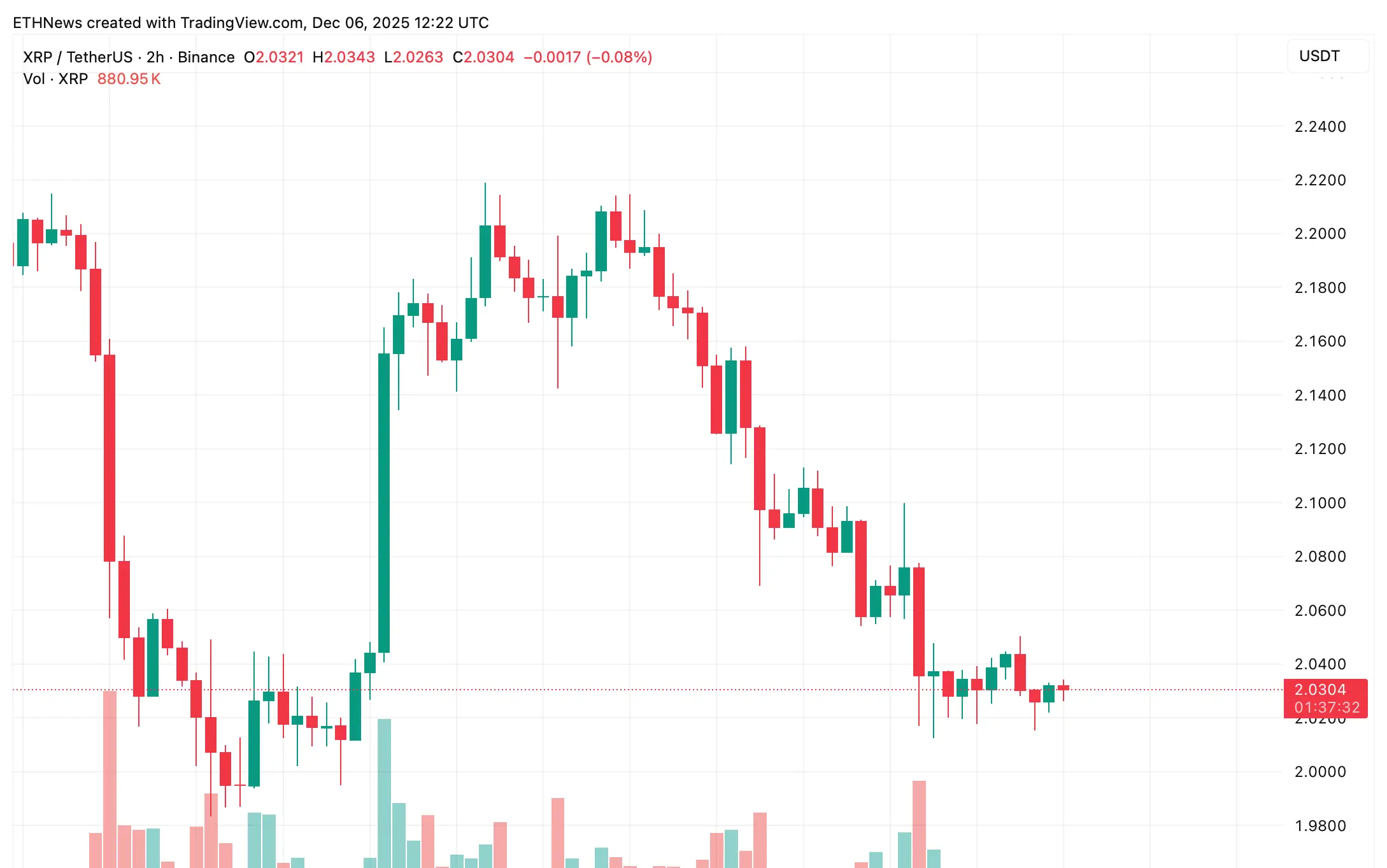 XRP tetap dekat $2.03 setelah penurunan perlahan dari puncak awal Desember. Sampai lilin berikutnya tertutup, kedua kemungkinan tetap terbuka: