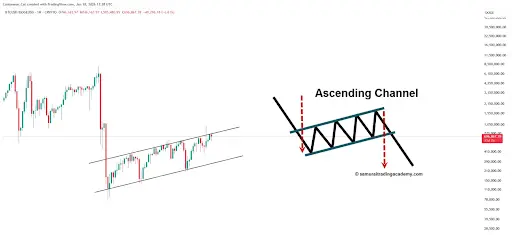Analisis teknikal dari grafik BTCUSDT/DOGEUSDT menunjukkan kedua raksasa kripto ini diperdagangkan dalam sebuah saluran naik yang telah berulang kali menguji batas atasnya tanpa breakout yang meyakinkan, sebuah tanda bahwa tren kenaikan mungkin melemah. Dalam kerangka perdagangan teknikal, kegagalan mempertahankan momentum di resistansi sering kali mendahului pembalikan.