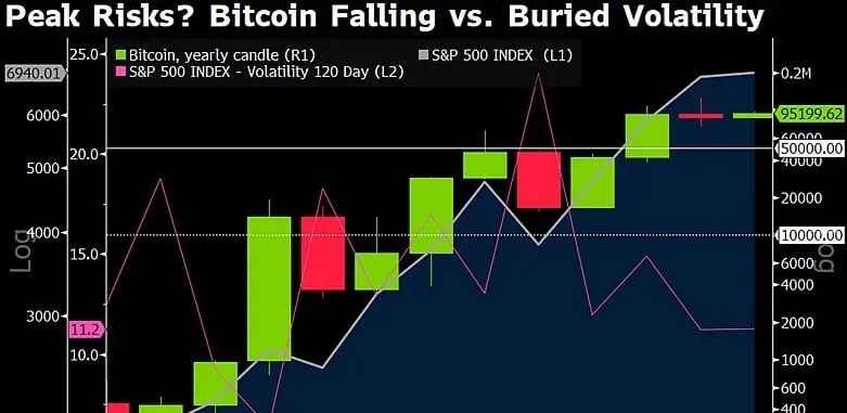 Selain komentar tertulisnya, McGlone membagikan sebuah grafik berjudul “Peak Risks? Bitcoin Falling vs. Buried Volatility,” membandingkan lilin tahunan BTC dengan indeks S&P 500 dan volatilitas ekuitas 120-hari. Grafik tersebut menggambarkan penurunan volatilitas bersamaan dengan peningkatan tolok ukur ekuitas, sebuah kombinasi yang dia pandang secara historis tidak menguntungkan untuk kenaikan crypto yang berkelanjutan.