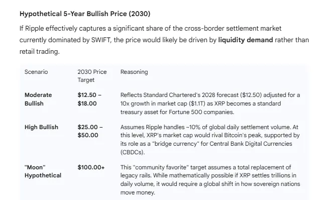 Jika Ripple berhasil masuk ke posisi di mana ia dapat menjadi ancaman besar bagi bank tradisional, harga XRP bisa merasakan dampak signifikan. Google Gemini memberikan proyeksi harga hipotetis lima tahun berdasarkan asumsi likuiditas global: