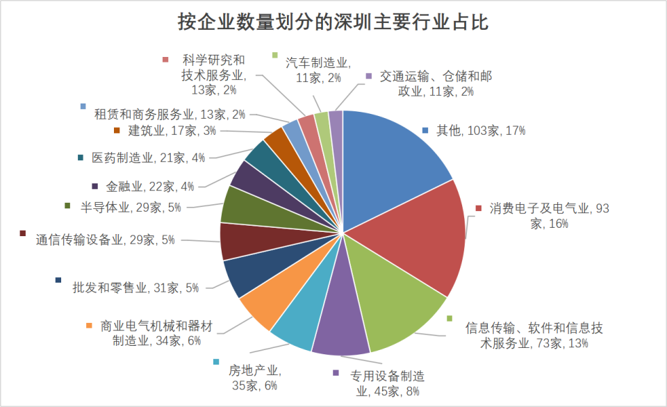 从2025年的深圳入库企业来看,这两个动作颇具成效。580家深圳企业覆盖了38个一级行业,其中,四大行业(消费电子及电气业,信息传输、软件和信息技术服务业,通信传输设备业,汽车制造业)分别有企业93家、73家、29家和11家,占到全市入库企业总数的1/3(35.52%)和总营收的四成以上(44.88%),这与深圳在2018年确立的七大战略性新兴产业基本吻合。