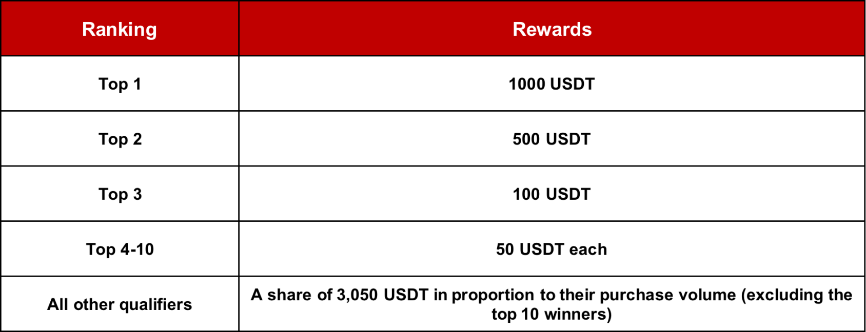 * The reward for the qualified users other than the top 10 winners = (Each user’s total purchase volume / all qualified users other than the top 10 winners’ total purchase volume) *3050 USDT.
