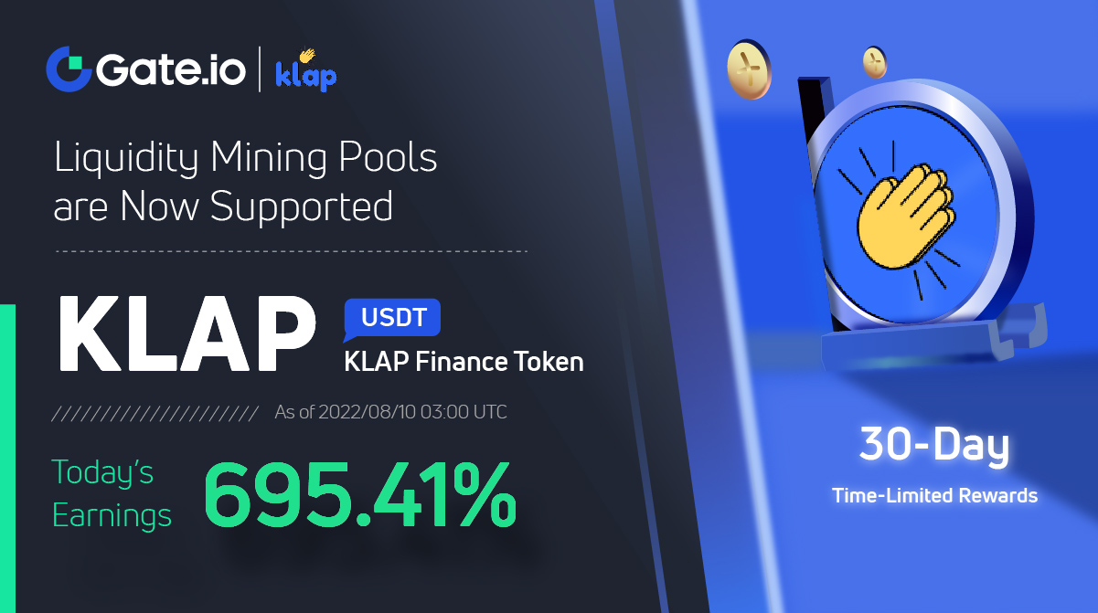 Liquidity mining pool (in Normal Trading Mode) for KLAP/USDT trading pair are officially enabled on Gate. We also added an extra time-limited bonus of 86,670 KLAP to them respectively on August 9th, 2022 at 7:00 UTC.