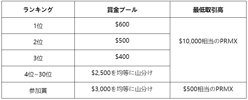 取引高に基づく資格のあるユーザー全員が$7,000相当のPRMXの山分けを得れます。