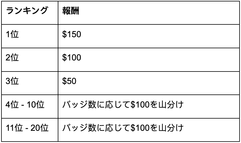 上位20名はバッジ数に応じて賞金プールの山分けを得ることができます。
