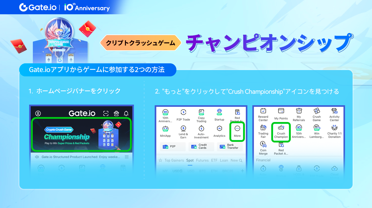現在、Gateクリプトクラッシュチャンピオンシップ(10周年記念特別版)は開催中!初回ログインで無料でバッジを獲得し、1vs1のバトルゲームを始めよう。Gate10周年記念レッドパケット&ゲームを楽しみながら豪華賞品手に入れよう!