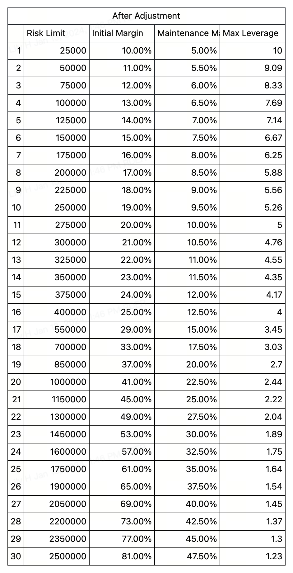 上記の無期限契約に対する調整は、1 月 13 日 08:00 UTC に発効します。この時間より前にオープンされたポジションには、調整前のリスク制限と、対応する初期および維持レベルが引き続き適用されます。