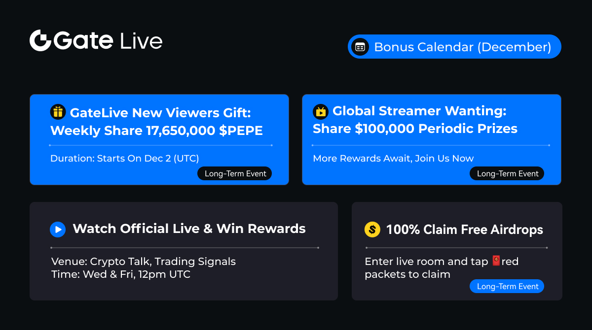 GateLiveの12月のイベントカレンダーを体験して、ボーナス満載の興奮を見逃さないでください!最新のイベントはこちらで更新されます: GateLive公式投稿アカウント and [GateLive X(Twitter) アカウント](http://x.com/GateioLive "GateLive X(Twitter) アカウント)。もっとボーナス情報をフォローしてください!