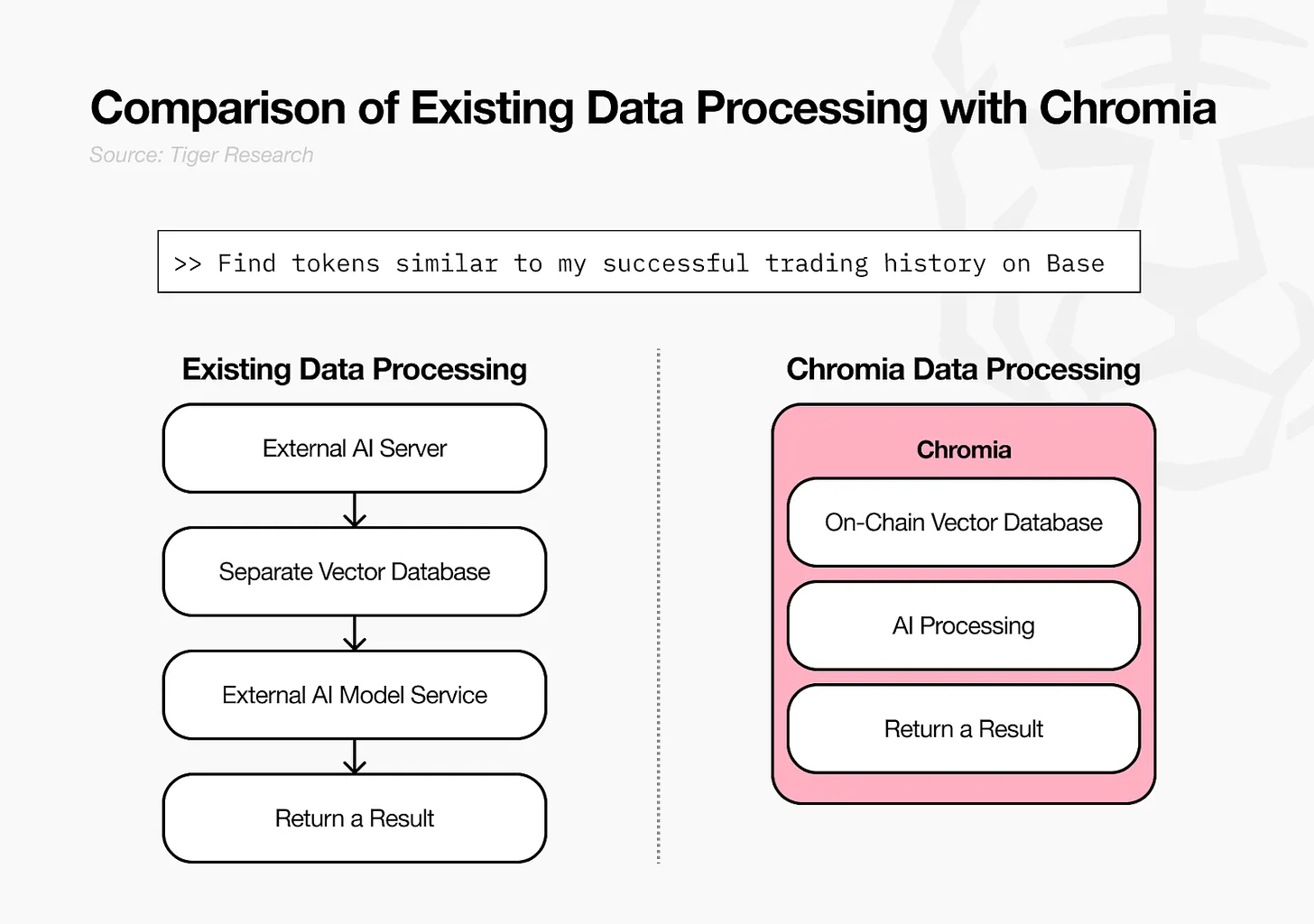 Chromiaは、ベクトルデータベースをブロックチェーンに直接統合することで、基本的なソリューションを提供します。 Chromiaでは、ユーザークエリをベクトル化し、チェーン内で直接類似のデータを検索して結果を返すなど、すべての処理をインチェーンで行い、単一環境処理の全プロセスを実現します。