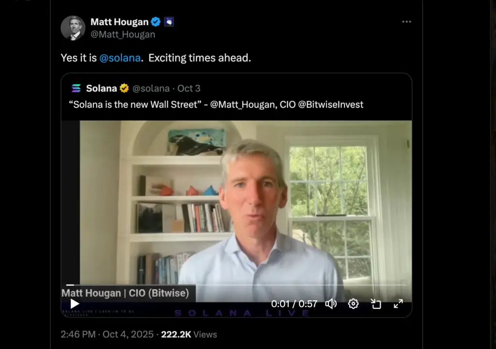 Bitwiseのマット・ホーガンによると、ソラナがわずか150マイクロ秒で取引を完了できる能力は、「ウォール街が好む取引方法に完璧です」とのことです。