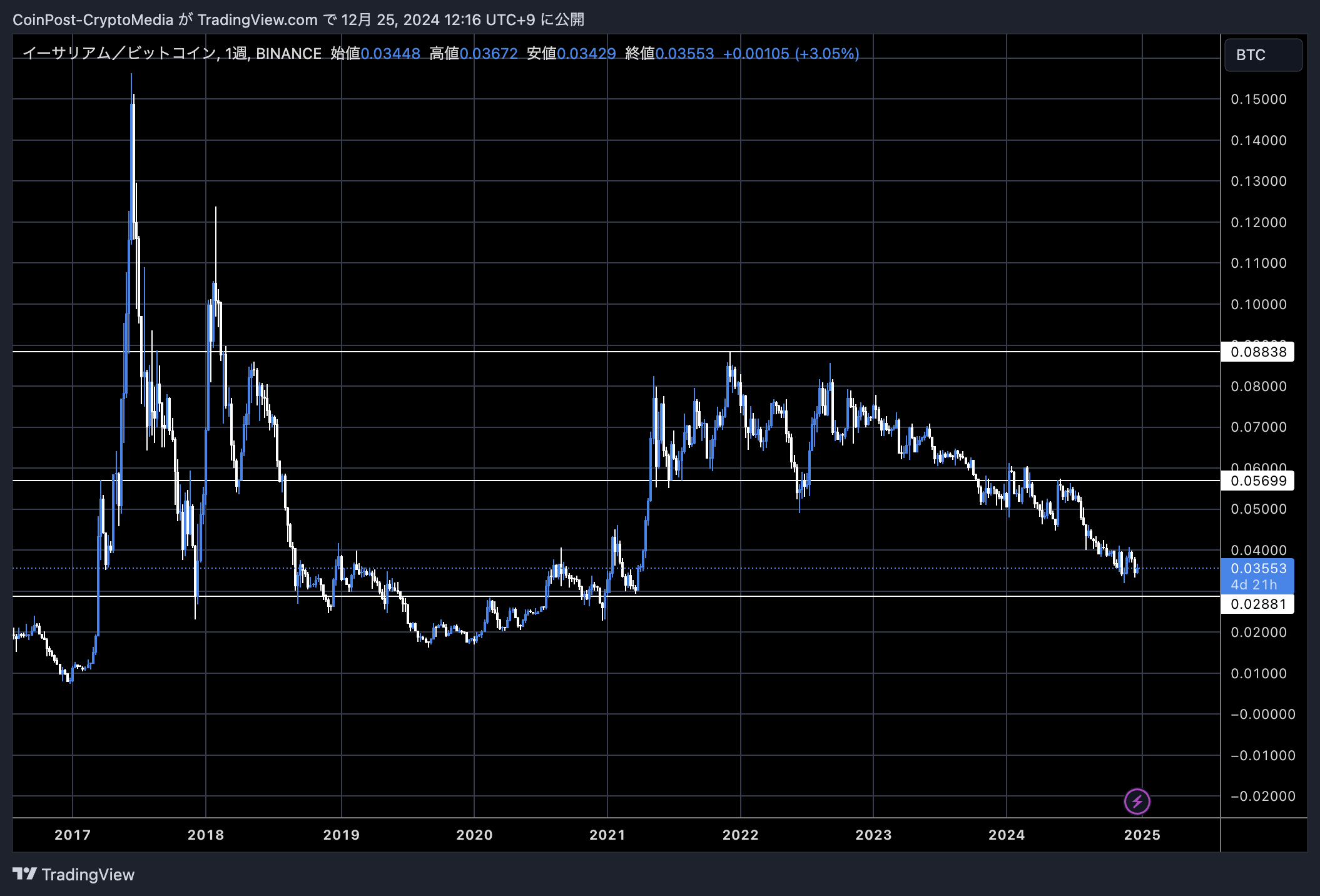 ただし、ビットコイン(BTC)建の通貨強弱を見ると、機関投資家の増加にしたがって年単位で右肩下がりであるため、ETH/BTCが底打ち反転するまでは、過去のアルトシーズンほどの期待値は見込めないだろう。