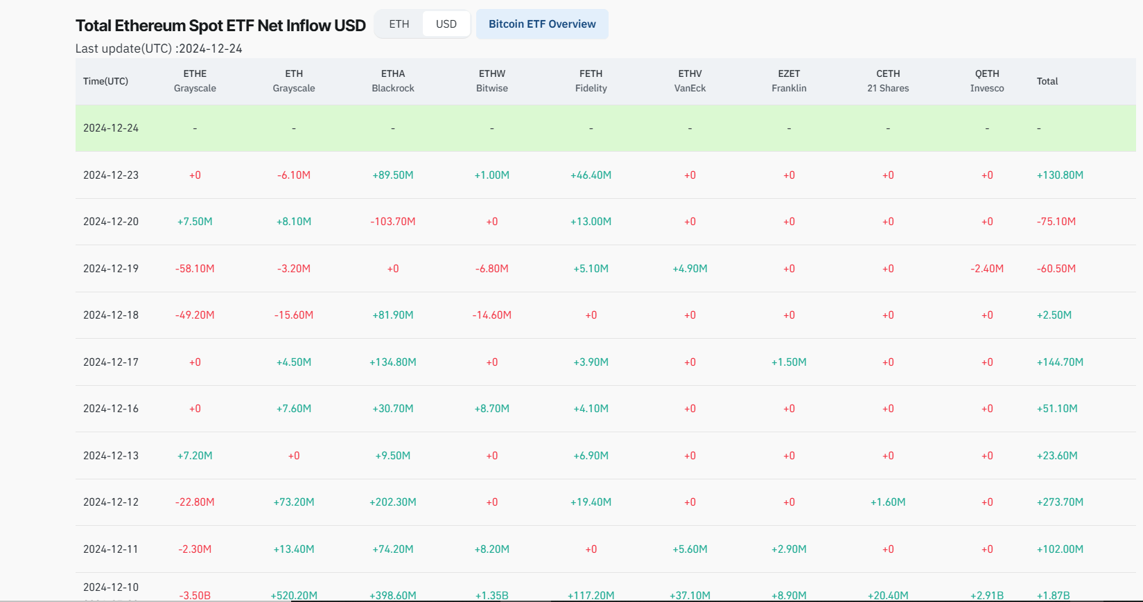 Coinglassのデータによると、23日時点でイーサリアムETFは1億3,080万ドルの純流入を記録。その一方で、ビットコンETFからは2億2,650万ドルの資金流出が確認された。