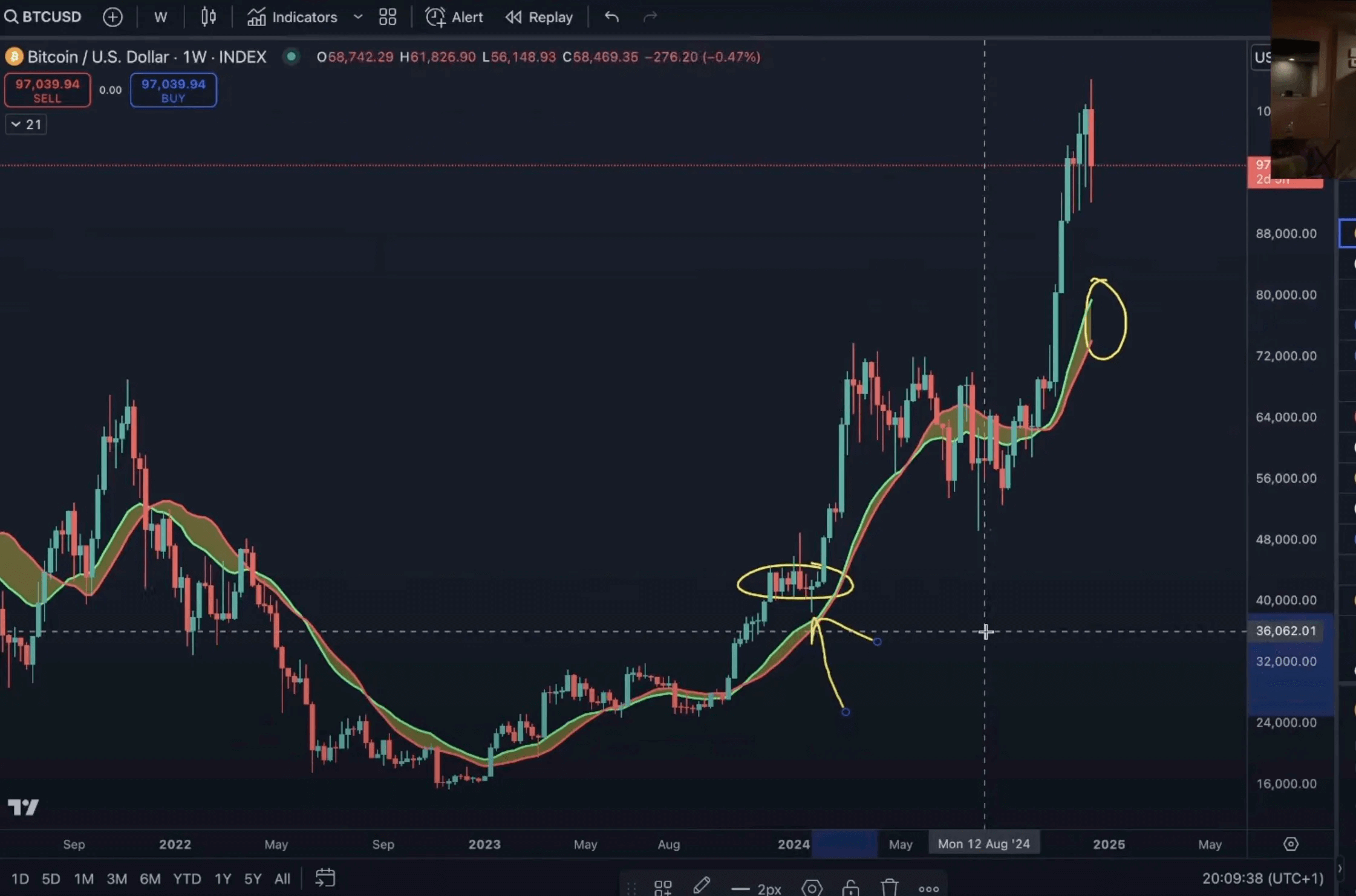 コーエン氏によると、調整が生じた場合のサポートレンジは7.2万ドルから8万ドルの範囲。これは20週SMAと21週指数移動平均線(EMA)で形成される「ブルマーケット・サポートバンド」に相当する。
