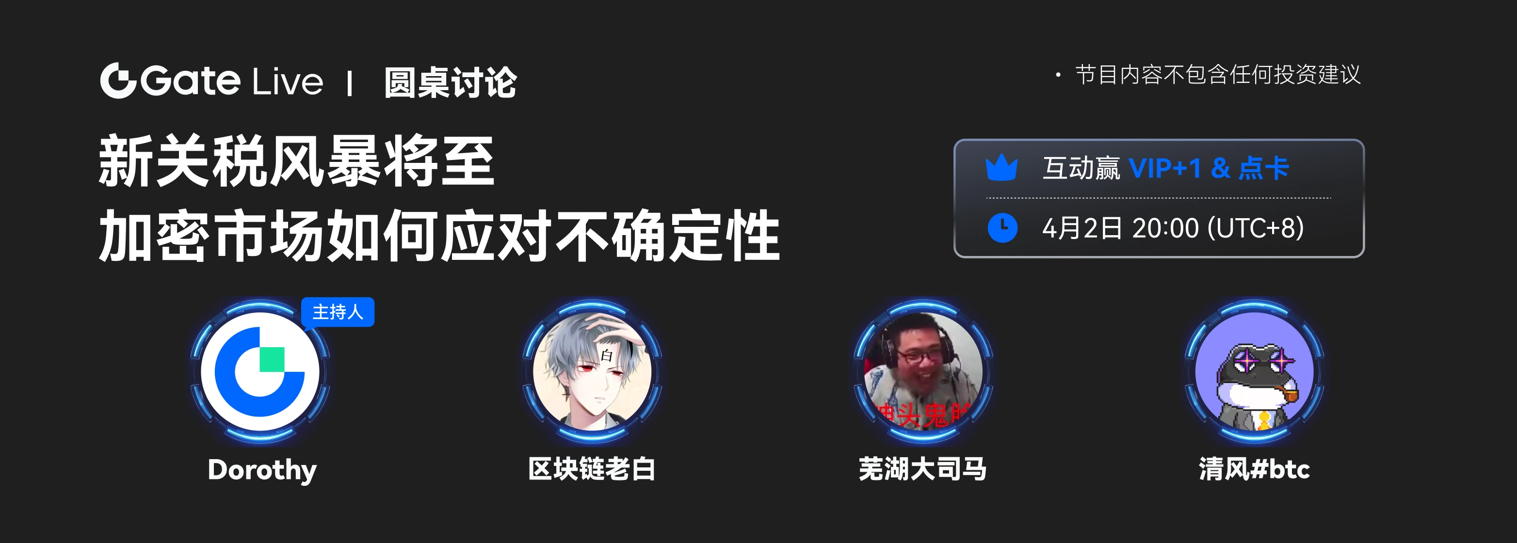 GateLiveは4月2日20:00(UTC+8)にライブチャンネル《円卓討論》を開催します。 私たちは3人のブロックチェーン研究者を招待し、発表される新しい関税政策について共に考察し、その暗号資産市場への潜在的な影響や投資家の対応策を分析します。ライブ配信を視聴し、ライブチャンネルで無料でエアドロップを受け取ってください: