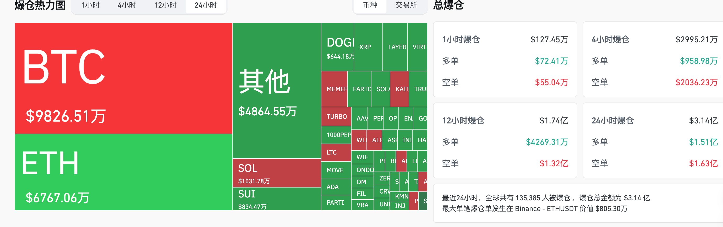**強制清算状況:**世界中で1135385人が強制清算され、総額は3.14億ドル、そのうちBTCの強制清算は9826万ドル、ETHの強制清算は6767万ドル、SOLの強制清算は1031万ドルです。