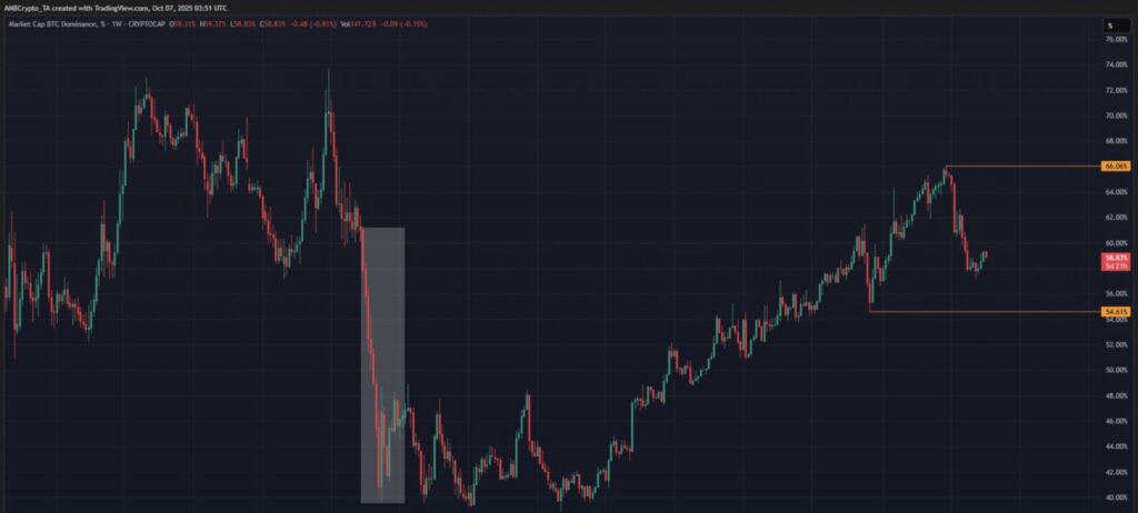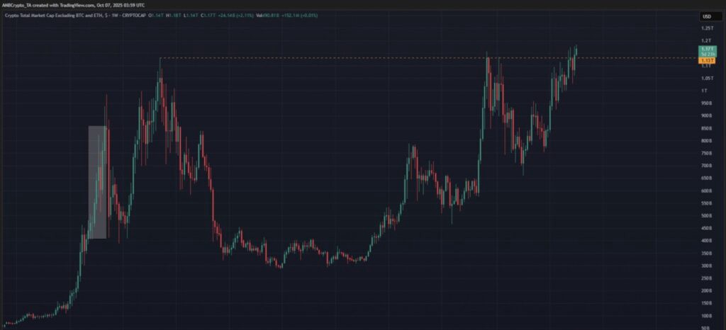 報告によると、アルトコイン市場は今後数週間でポジティブなブーストを受けると期待されています。9月は歴史的に非常にボラティリティが高いことで知られていますが、今回は比較的安全に過ごしました。現在、イーサリアム (ETH) は $4,700 の供給ゾーンに挑戦しており、ビットコイン (BTC) は10月5日の日曜日に新たな最高値を記録しました。これら2つの主要な暗号通貨が*価格発見*フェーズに入ろうとしている中で、重要な質問が浮かび上がります。アルトコイン、大きいものと小さいもの、は近い将来に何を期待できるのでしょうか?**アルトコイン市場が上昇の可能性を経験している**Xプラットフォームの投稿で、ある暗号通貨トレーダー兼アナリストが、なぜ彼がビットコインの保有分の一部を売却し、資金をアルトコインに移しているのかその理由を明らかにしました。彼によると、この動きはアルトコインの潜在的なリターンが高いために行われたが、一方でそのボラティリティもはるかに大きい -- つまりリスクが増加したことを意味する。2025年10月7日現在、アルトコインシーズン指数は約75で推移しており、市場がアルトシーズンの瀬戸際にあることを示している。アルトコインが集団的にBTCを上回る期間である。 しかし、アナリストは現在の市場状況が2017年よりもはるかに厳しいことを強調しており、その年にはほぼすべての暗号トークンが同時に急騰し、「真のアルトシーズン」と呼ばれた。この時、特定のアルトコインのみが大きな上昇を経験する可能性が高い。また、アルトコイン市場では取引量が再び増加し始めているが、彼は分析の最も重要な部分を議論の終わりに残している。**アルトコインは上昇する傾向がある時...**資本回転の概念は重要であり、忘れてはいけません。ビットコインの価格が上昇するほど、保有者の利益は大きくなります -- そして、新しい投資家や以前に傍観していた人々の間でFOMO効果が強まります。しかし、特定のポイントに達すると、BTCの価格は通常平坦になり、横ばいになる一方で、以前は遅れていたアルトコインが急激に上昇し始め、新たな資本が市場に流入することによって推進されます。アナリストによると、BTCの歴史的に低いボラティリティのフェーズは今や終わりに近づいており、次の大きな動きの可能性を示しています。彼は、BTCの$140,000の価格目標は依然として保守的すぎるかもしれないと述べており、問題のボラティリティ拡大は日次ではなく月次の時間枠であるとしています。比較すると、2021年には、ビットコインの市場支配率(BTC Dominance)が62.9%から40.87%に劇的に低下しました。これは3月から5月の間で、BTCの価格が$50,000-$60,000の範囲で推移していた時期です。同じ期間に、アルトコインの時価総額(ETHを除く)は、わずか2ヶ月で4068億ドルから(億ドルに倍増しました。これは、本当のアルトシーズンは通常、BTCが特定の範囲内で安定して動き、BTC Dominanceが急激に低下する時に発生することを確認しています。アルトコイン投資家にとってもう一つの重要な手がかりは、ビットコインとイーサリアムを除くTOTAL3チャート)のアルトコイン市場資本の新しい最高記録の出現です$857 。この指標は、市場の状況が投資家にとって高いリスクを取り、大きなリターンを得るのに理想的であることを示しています。それでも、投資家は意思決定を行う前に徹底的な調査(デューデリジェンス)を実施することを思い出さなければなりません。堅実な投資論を形成した後、結果を待つ自信と忍耐を持つことは、アルトコイン市場サイクルに対処する上で重要な鍵です。免責事項****このコンテンツは、読者の情報を豊かにすることを目的としています。この情報は、さまざまな関連情報源から収集されており、外部の影響を受けていません。資産の過去のパフォーマンスは、その将来のパフォーマンスを決定するものではないことに注意してください。暗号取引活動には高いリスクとボラティリティが伴いますので、投資する前に必ず自己調査を行い、現金を使用してください。ビットコインやその他の暗号資産投資の売買活動は、読者の責任です。*