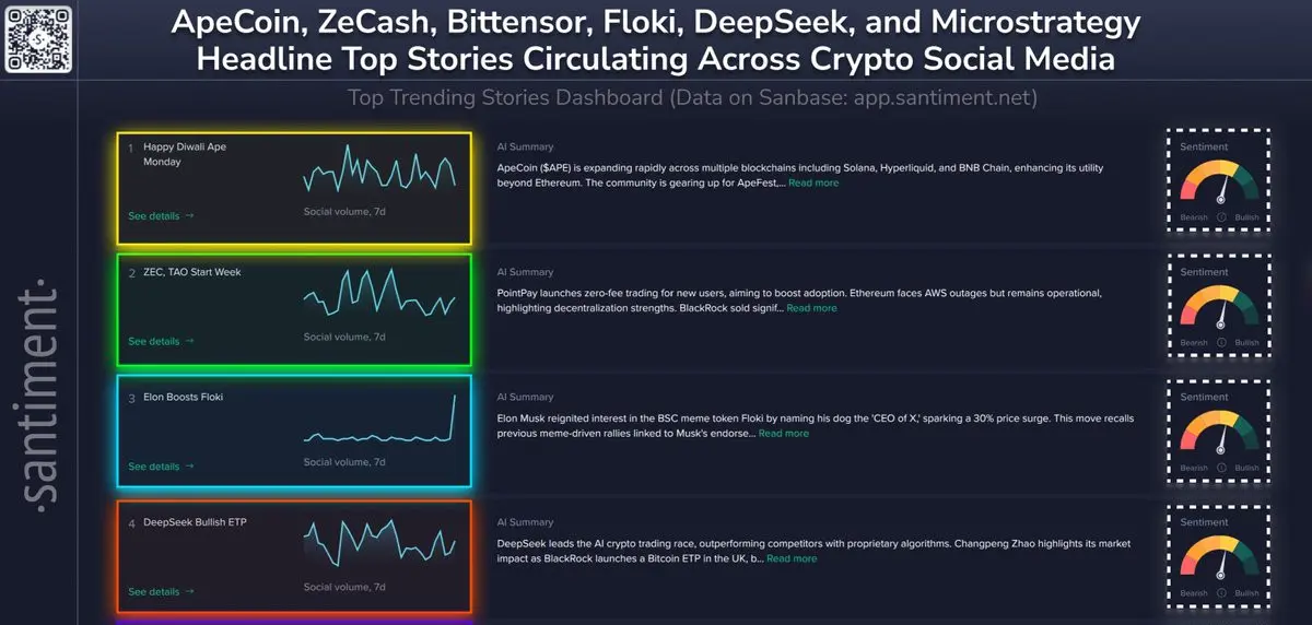 Santimentの最新のソーシャルダッシュボードは、市場の楽観主義の明確な再燃を示しており、ソーシャルメディアプラットフォーム全体でのトレンドの議論は、ApeCoin (APE)、Zcash (ZEC)、Floki (FLOKI)、DeepSeek (TAO)、そしてStrategy (STRAT)に集中しています。