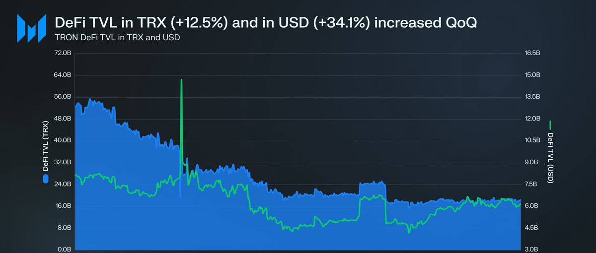 ロックされた総価値 (TVL) が TRON で 34.1% 増加し、62 億ドルに達し、新たな史上最高値を記録しました。JUST DeFi エコシステムが支配的な役割を果たし、$5 億の TVL を獲得し、前四半期から 46.1% 増加しました。アナリストは、TRON の一貫したオンチェーン活動と安定した USDT の流通が成長の要因であると評価しています。