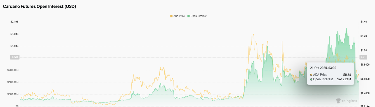 価格の動きは抑制されているものの、先物のオープンインタレストは2024年中旬以来、印象的な反発を示しています。今年の初めには$300 百万を下回っていたADAのオープンインタレストは、2025年10月21日時点で$600 百万を超えました。この増加は、トレーダーの参加と流動性の高まりを示しています。