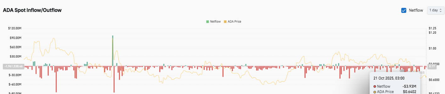 取引所のフローデータは異なる状況を示しています。2025年を通じて、ADAは一貫した流出を記録しており、短期的な売却圧力が減少し、潜在的な蓄積行動を示唆しています。10月21日には、ADAの価格が$0.64に下落した際に$3.93百万の純流出が伴いました。この動きは、保有者がトークンを取引所から移動させていることを示唆しており、おそらく長期保管またはステーキングのためです。