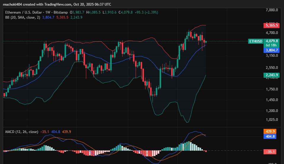 週次ETH/USDタイムフレームでは、ボリンジャーバンドが「W」パターンによって特徴付けられた潜在的なボトムを形成しています。最近の暗号通貨キャピタリゼーションに続き、1日でほぼ$20 億の清算が発生した後、ETH/USDペアはボリンジャーバンド指標のミドルバンドを再テストしました。