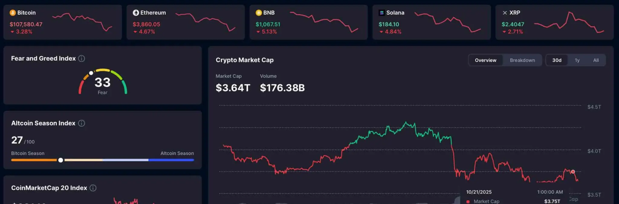 暗号通貨市場は10月21日に厳しい売り圧力に直面し、数時間で$110 億ドル以上の市場価値が失われました。総市場キャップは約3.75兆ドルから3.64兆ドルに急落し、ビットコイン(BTC)と主要なアルトコイン全体でパニック売りが広がりました。
