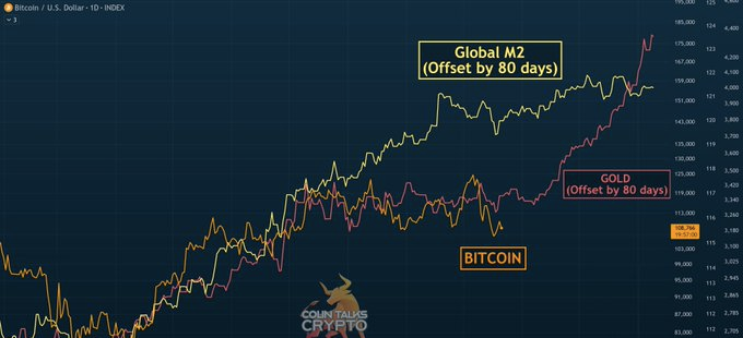 * **コリンによれば、金の上昇は過去のサイクルでBTCを約80日先行していることが多い。*** **BTCとグローバルM2の相関関係は過去3ヶ月で弱まった。*** **BTCは流動性に非常に敏感であるため、政策の指針がタイミングに影響を与える。**アナリストによると、ビットコインの次の動きは金の上昇から影響を受けるかもしれません。彼は、金がビットコインを約80日リードする歴史的なパターンを追跡しました。彼の最新のオーバーレイは、BTC、金、グローバルM2を比較しており、金が急上昇する一方でビットコインは遅れをとっていることを示しています。リードは単純で、リードラグが保持されれば、BTCのハンドオフウィンドウは12月下旬から1月にかけてですが、タイミングは金のモメンタムが冷却する時期と、グローバル流動性シグナルがどのように整列するかに依存します。# なぜ金のリードが今重要なのか金は10月に新たな記録に跳ね上がり、それに伴ってセンチメントも高まった。アナリストのサイクル作業では、金の上昇ラインが遅れたBTCのプッシュをしばしば先行するため、トレーダーはこれを価格ターゲットではなくタイミングのサインとして扱う。# ビットコインとグローバル流動性比較チャートは、グローバルM2をビットコインの価格動向における流動性の役割の中心的な指標として位置付けています。歴史的に、M2が拡大すると、流動性がリスク資産に流れ込み、しばしばビットコインの価値を押し上げます。アナリストは、M2の動向がビットコインの価格変動を約80日先行する傾向があることを観察し、ビットコインが世界的な貨幣拡張に対して敏感であることを強調しました。2024年1月から、ビットコインスポットETFのローンチ後、ビットコインとM2は共に動き、機関流動性と暗号市場の間のより強いリンクを示しました。しかし、過去3ヶ月間、その関係は弱まり、ETF承認以来最も弱くなっており、デカップリングフェーズの可能性を示唆しています。# ピーク付近の相関が弱まる信号バックテストは、以前のサイクルのピーク付近でのデカップリングを示しています。このパターンは正確なトップを予測するものではありませんが、BTCが金やM2の後れを取った後に、サイクル後半のプッシュを行う可能性があることを警告しています。だからこそ、今後数ヶ月が重要なのです。政策主導の流動性の指標が強化されると、M2のリンクが再び引き締まり、BTCの動きが前倒しされる可能性があります。流動性が不安定なままで金が落ち着くと、順次2026年初頭に滑り込むことになります。# BTCの次の進む道を変えるものは何か* 流動性インパルス:主要中央銀行からの明確な緩和またはバランスシートの成長は、BTC--M2のリンクを引き締め、タイミングの信頼性を向上させる。* ゴールドのモメンタムが薄れる: ゴールドのロールオーバーが80日間の枠組みの下でBTCの引き渡し時計をスタートさせる。* リスクオフショック:政策のサプライズや資金調達のストレスが、引き継ぎを遅らせ、BTCをレンジに留める可能性があります。