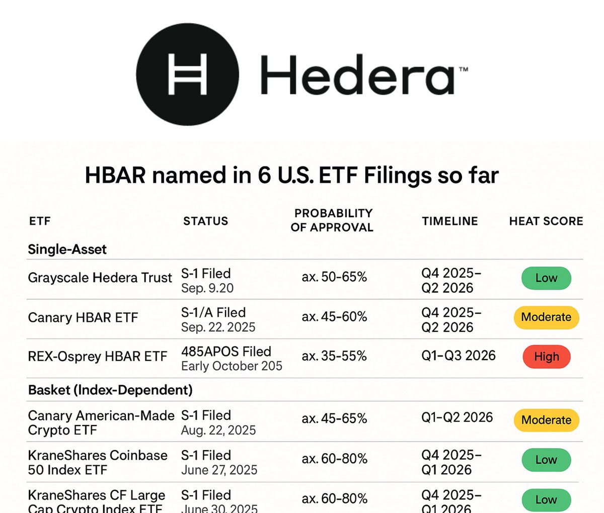 これらの申請の承認確率は35%から80%の間にあり、審査期間は2025年第4四半期から2026年中頃までの間になると予想されています。GrayscaleやKraneSharesなどの主要発行者からの複数の申請が存在することは、Hederaのエコシステムと次世代の規制された暗号資産投資商品におけるその役割に対する機関投資家の関心が高まっていることを示しています。