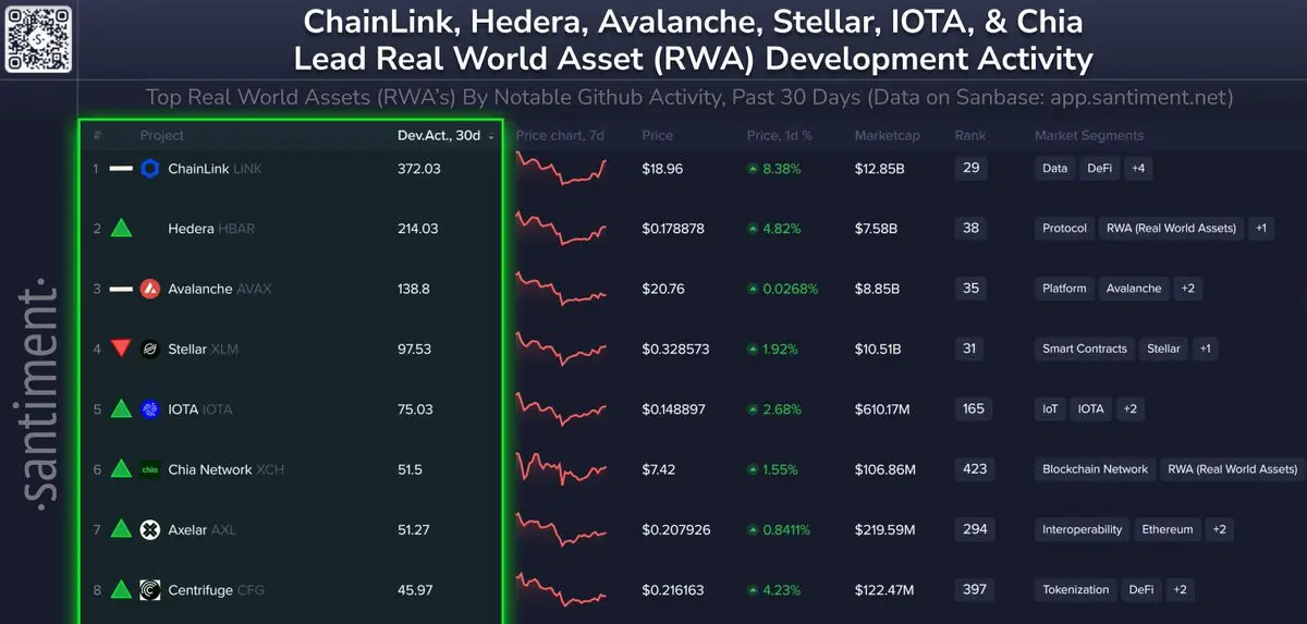 ETFの開発に加えて、Hederaは印象的な技術的成長を示し続けています。Santimentのデータによると、Hederaはすべての実世界資産(RWA)プロジェクトの開発活動において2位にランクインしており、Chainlinkに次ぎ、Avalanche、Stellar、IOTAの前に位置しています。