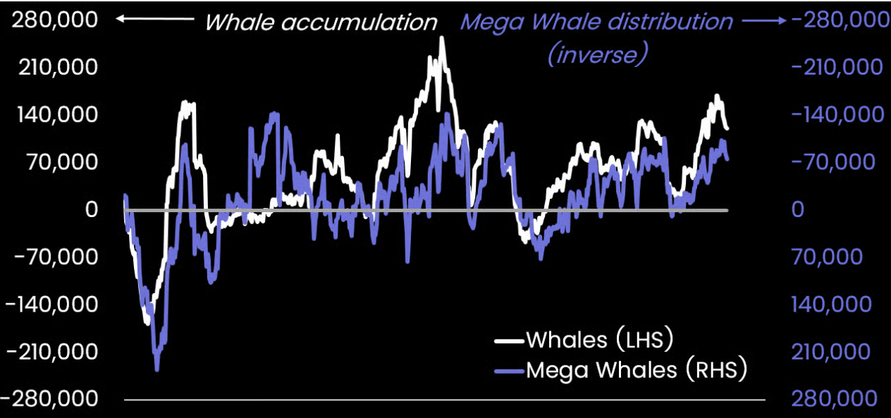 この会社は、この分配トレンドがGlassnodeのデータにも反映されていることに注意しています。ホルダー(が1,000~10,000 BTC)を保有している間、メガホルダー(が10,000 BTC)以上のエクスポージャーを減少させており、大規模な再分配に一致するパターンです。