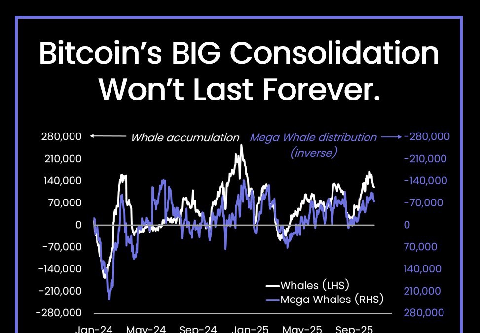 その研究会社は、ビットコインの「大きな統合は永遠には続かない」と結論付けています。報告書は、クジラの蓄積とメガクジラの分配がほぼ均衡に近づいているため、ボラティリティが再び拡大する可能性が高く、主要な方向性の動きの舞台が整う可能性があることを示唆しています。
