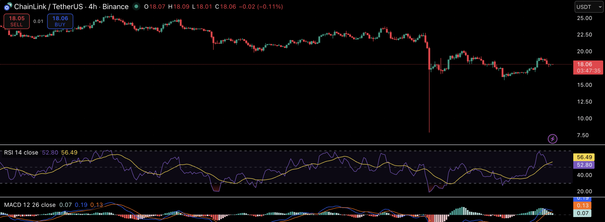 開発におけるリーダーシップポジションにもかかわらず、Chainlinkの価格はその勢いを反映していません。現在、LINKは$18.06で取引されており、過去24時間で約4.8%、週で2.4%の下落を示しており、市場資本は122.5億ドルです。テクニカル指標は、LINKがアナリストが「健康的な蓄積フェーズ」と呼ぶ状態にあることを示しています。