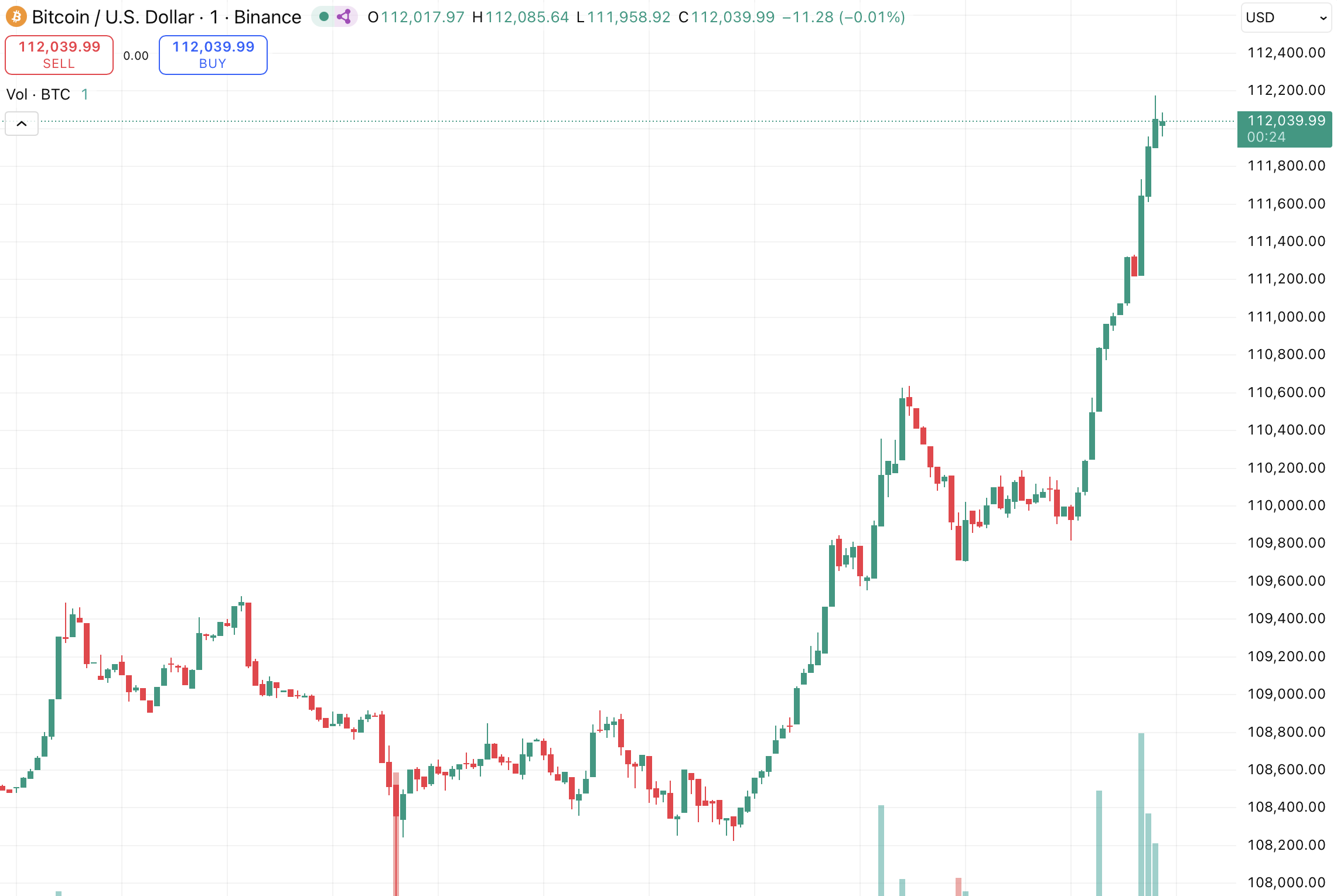1分足チャートでは、ビットコインが絞り込まれたウェッジパターンからの明確なブレイクアウトを示しており、主要な取引所でのスポット需要の増加と売り圧力の減少によって促進されています。数時間で$109,000から$112,000を超えるクリーンな上昇は、蓄積ブレイクアウトを示唆しており、トレーダーは次の抵抗範囲として$114,000–$116,000を注視しています。