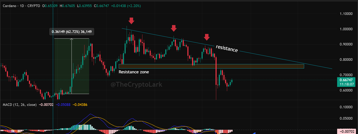 デイビスは、カルダノがこのパターンを示した最後の時に、数週間以内に急上昇したことに注意を促しました。「$ADA は、ゼロ以下で日次MACDゴールデンクロスを印刷しようとしています。最後にこれが起こったとき、カルダノは60%以上上昇しました。」と彼は書きました。しかし、彼はADAが$0.74と$0.77の間で強い抵抗に直面しており、8月以来すべてのラリーを抑えてきた下向きのトレンドラインがあることを警告しました。