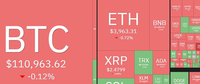 暗号通貨市場は引き続き混合トレンドを維持しています。22日午前5時30分のデータプラットフォームのデータによると、ビットコイン(BTC)は$110,963.62で取引されており、前日から0.12%の下落です。