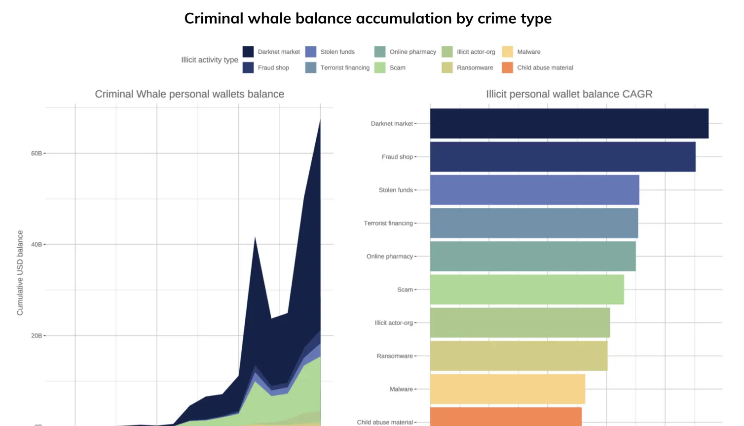 ダークネット市場は、これらの保有の大部分を占めており、約462億ドルをコントロールしています。2011年の悪名高いシルクロードにその起源を持つこれらの地下ネットワークは、検出を回避するためにプライバシー技術や分散型ツールを活用し、洗練されたエコシステムに進化しています。分析によれば、これらの市場は暗号の価格上昇からも恩恵を受けてきました。