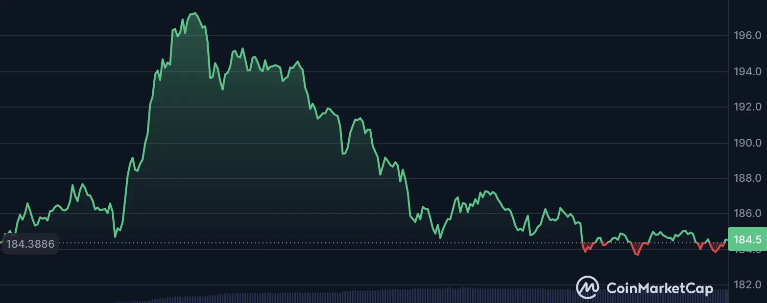 ソラナ (SOL)は、発表時点で$184 の周辺で取引されており、市場資本は$100 億を超えており、トップティアのブロックチェーン資産としての地位を強調しています。