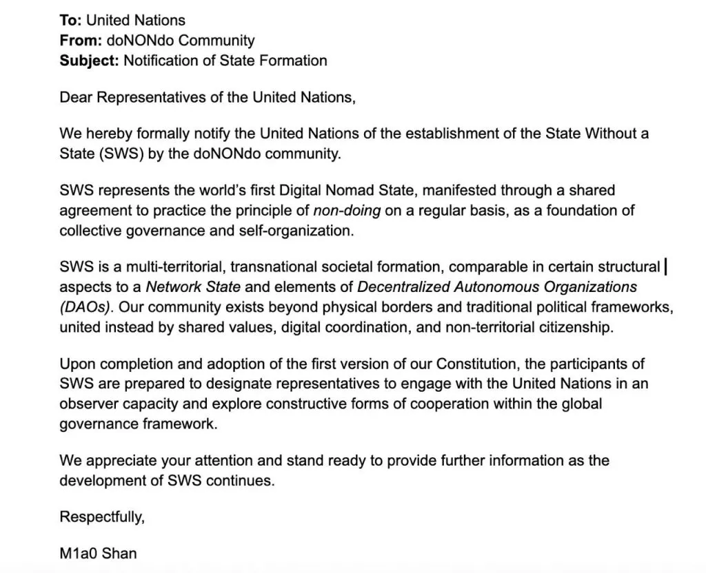 # doNONdoはデジタル国家の作成を発表しました11月4日、メムトークン doNONdo (DND10) のクリエイターが、世界初のデジタルノマド国家 – State Without a State (SWS) の立ち上げを発表しました。公式なマニフェステーションは11月5日に予定されています。宣言は無活動の集団的実践の形式で行われます。プロジェクトコミュニティの参加者は、世界中で同時に少なくとも10分間、何もしないことに費やします。> > *「SWSのポジティブな特性を視覚化し、具現化することが提案されています — 地球上の何百万もの生き物に対する平和的で創造的、変革的な影響です」とメッセージには書かれています* > > > doNONdoの創設者は、新しい国家構造の出現と組織の常設総会に代表者を派遣する準備ができていることについて、国連に公式通知を送りました。SWS国連への打ち上げ通知。ソース: 電報> > *「私たちのイニシアティブは、すべての生き物が同じ志を持つ者と、あらゆる原則や関心に基づいて結びつくという普遍的で宇宙的な権利に基づいています。私たちは領土を主張せず、主権を争うこともしません — ただ単に、すべての生き物の自己決定権を主張します」とプロジェクトの創設者ミャオ・シャンは述べました*> > > SWSへの参加は「すべての生き物」に開かれており、アルゴリズムや人工知能を含みます。コミュニティのメンバーは、居住国の法律を遵守する義務があります。創設者によれば、「国家なき国家」は、想像力とデジタルコンセンサスを通じてポスト資本主義の現実の行き詰まりからの建設的な出口を提供している。doNONdoは2024年に登場しました。その時、プロジェクトチームはホワイトペーパーを公開し、トークノミクスを発表しました。2025年1月、開発者たちはMarathonを立ち上げました―無活動の実践を普及させるためのイニシアティブです。マラソンの最初のエピソードの一環として、doNONdoは100百万DND10 (~$100 000)を配布しました。2月に何もしないことについてのグローバルなリファレンダムが行われ、無為の力のアイデアを推進するコミュニティの始まりを示しました。