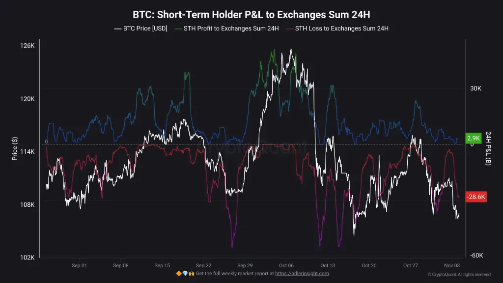 CryptoQuantのアナリストMaartuunは、過去24時間で短期ホルダーが28,600 BTCを売却し、29億ドルの損失を出したことを強調しました。