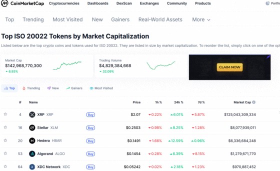 コインマーケットキャップ「ISO 20022」タブ新設、エックスアールピー(XRP)が1位を記録および市場への影響