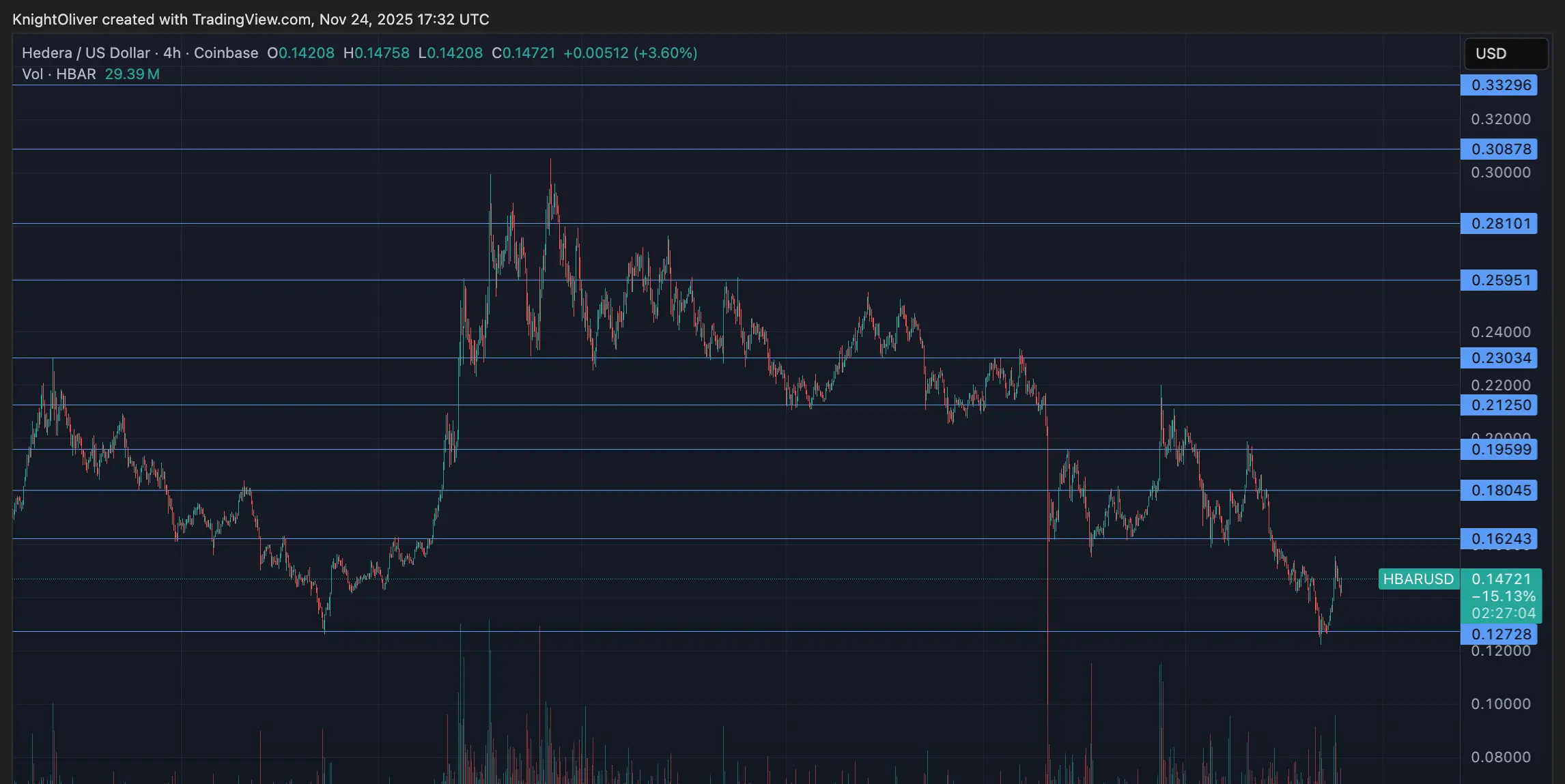 $0.1410付近でサポートが形成され、遅い時間の買いが下落を安定させました。短期的なデータでは、強い60分間のリバーサルがHBARを$0.1413から$0.1443に押し上げ、堅実なボリュームで強気のモメンタムを新たに確立されたサポートの上に強化しました。それでも、広範なトレンドは重く、9月以来市場を形作ってきた持続的な低い高値によって定義されています。