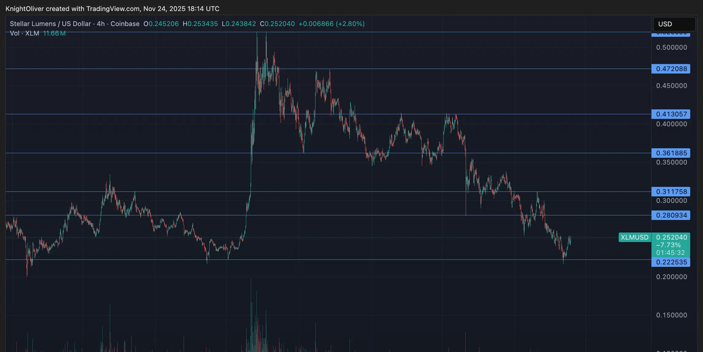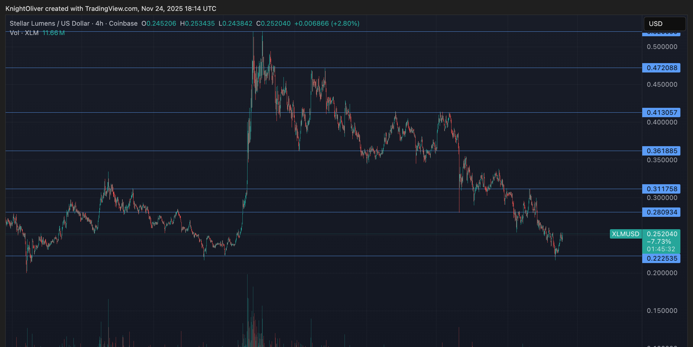 しかし、セッションの終わりに勢いが変わり始めました。取引の最後の数分間に大量の売り注文が入って、XLMは$0.2477から$0.2449に、16:58の2.8百万トークンスパイクで下落しました。この突然の反転は利益確定の圧力を示し、新たな下落リスクを示唆しました。