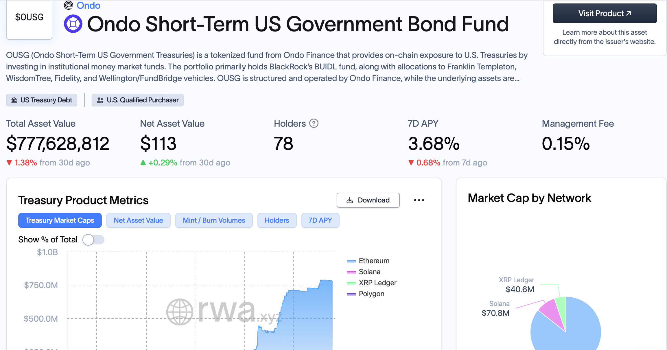 機関投資家向けに設計されたOndo短期米国政府債券ファンド(OUSG)は、24時間年中無休の償還に加え、推定年利回り3.68%で国債へのオンチェーンエクスポージャーを提供します。このトークン化されたファンドは、約$777 百万のロックされた総価値(TVL)を持っています。
