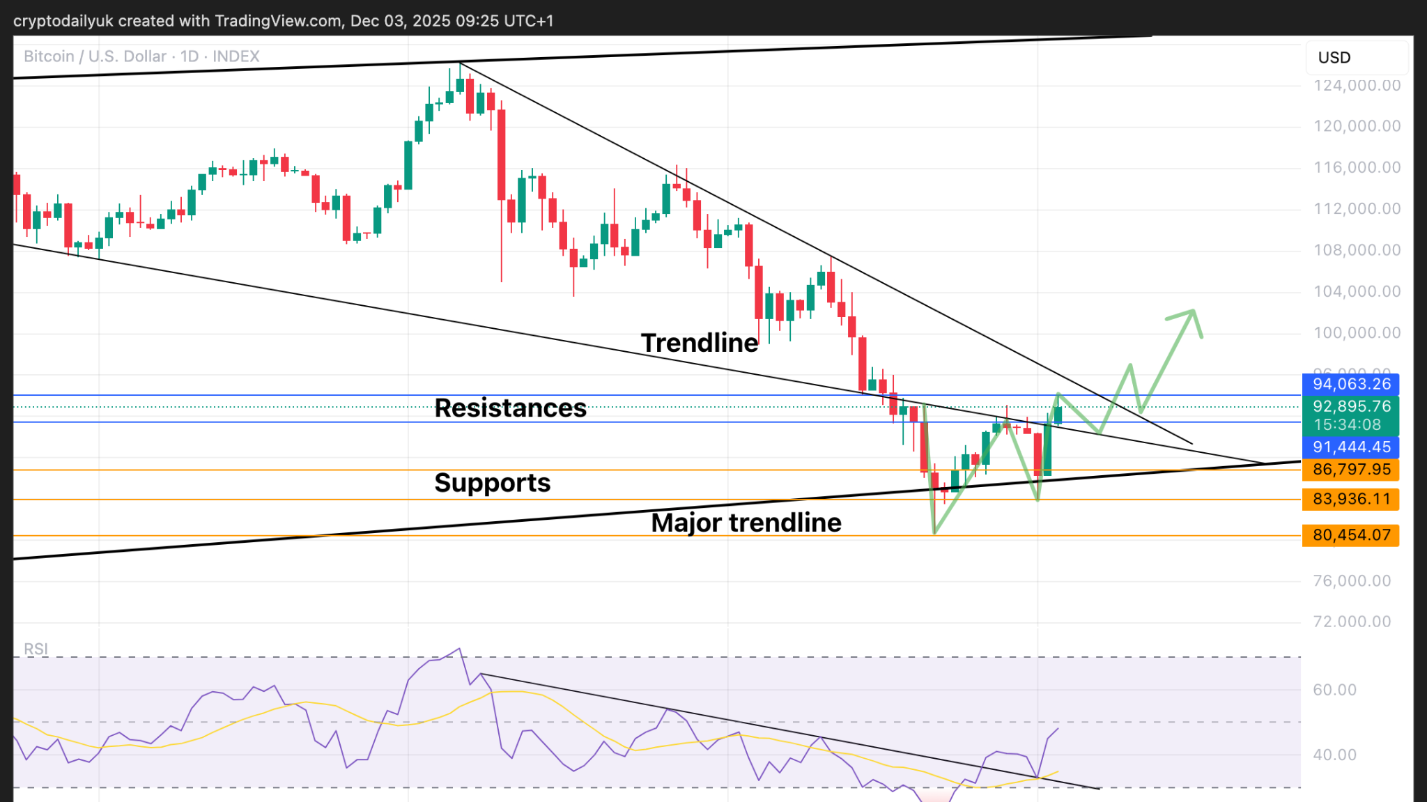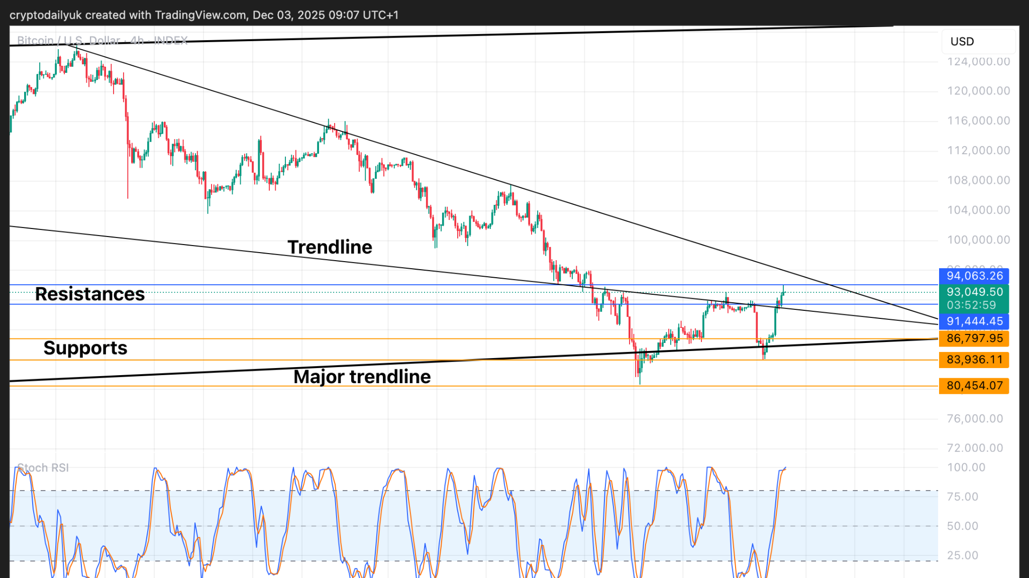 しかし、強気派がすぐに反応し、$10,000の急騰が非常に速く起こりました。この急騰により、価格は主要なトレンドラインを再び上回り、別の下降トレンドラインとレジスタンスも突破し、おそらく$94,000の水平レジスタンスで勢いが止まった形となりました。