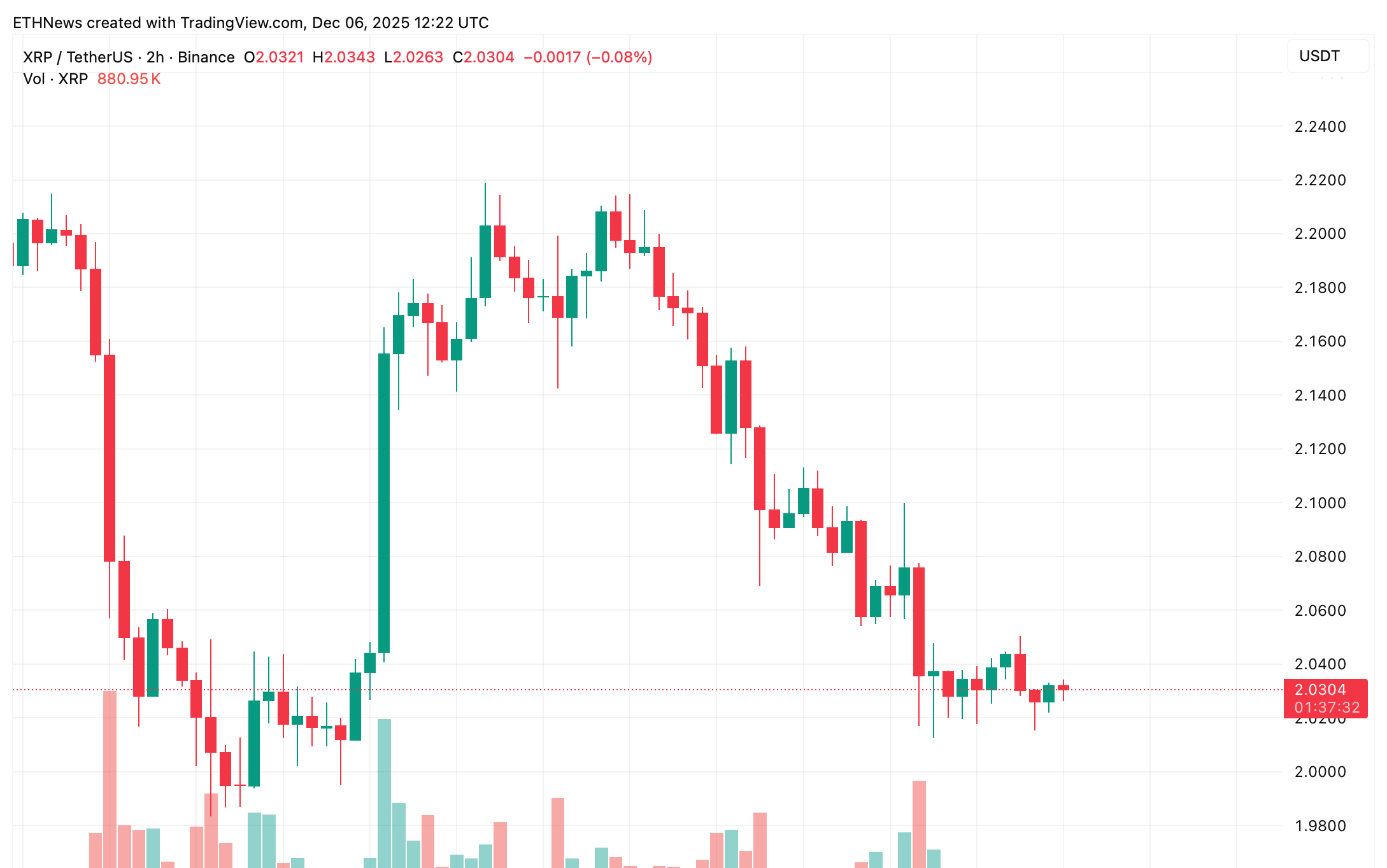 XRPは12月初旬の高値からじわじわと下落し、$2.03付近にとどまっています。次のローソク足が確定するまで、どちらの結果もあり得ます。