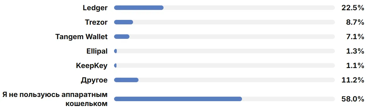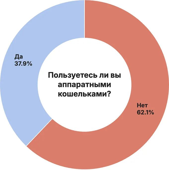 回答者の62.1%はハードウェアウォレットを使用していません。コールドストレージを好む読者はLedgerを22.5%選択しています。